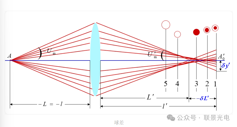 球差是透镜中存在的一种轴上点像差。轴上物点发出的光线通过透镜在像方成像时,不同孔径角的光线被透镜折射的程度不同,从而在像方光轴上聚焦到不同的轴向位置。