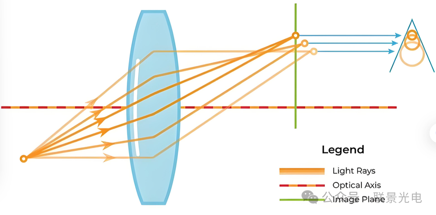 影响表现: 球差会导致图像清晰度下降。在像面上,点光源会形成一个圆形弥散斑而不是锐利的点。如果在像方放置移动光屏查看,成像结果会从模糊的弥散圆逐渐汇聚,出现中央有亮斑、四周有亮环的图像,但无法找到所有光线完全汇聚的位置。