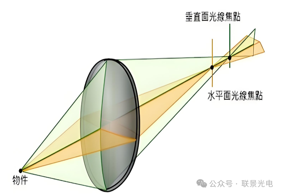像散是指轴外物点发出的光束,在通过光学系统后,其子午像点与弧矢像点不重合的现象。