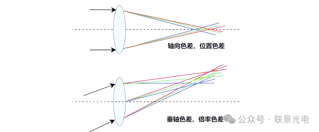 色差是由于光学材料对不同波长的光具有不同的折射率,导致不同颜色的光成像位置和大小不同。色差分为位置色差(轴向色差)和倍率色差(垂轴色差)。