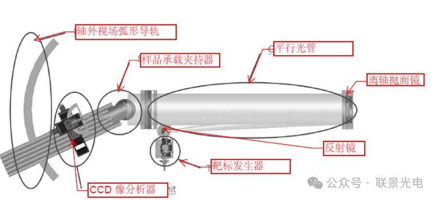 如上光路图,由靶标发生器发出一束光作为物体(即光源照射到滤光片及一定线宽大小的分划板(十字刻丝)),经过反射镜反射到离轴抛面镜后形成平行光。 平行光经过被测样品会聚到样品的焦平面, 然后由中继镜头检测样品焦平面,成像到CCD上。通过软件对十字象进行数据处理分析。